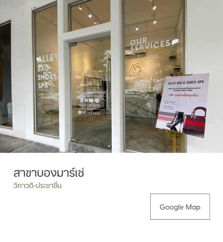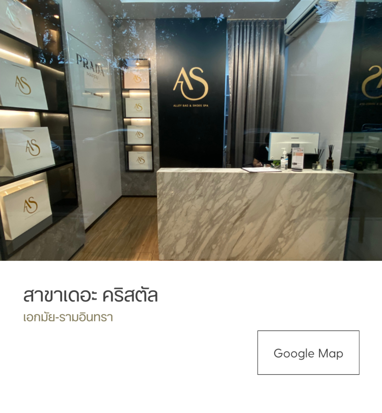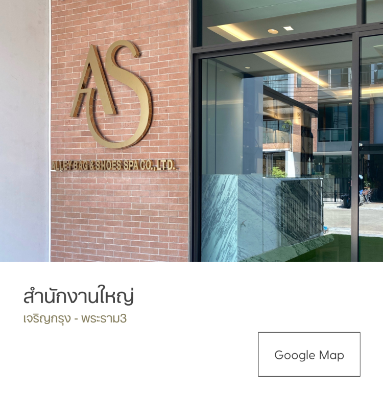 ปัจจุบันเรามี 3 สาขาพร้อมให้บริการด้วยทีมที่ปรึกษามืออาชีพที่จะคอยให้คำแนะนำในการสปาและการซ่อมแซมกระเป๋ารองเท้า และทุกงานที่ลูกค้าส่งเข้ามาดำเนินการโดยทีมช่างสำนักงานใหญ่เท่านั้น เรารักษาคุณภาพให้เป็นมาตราฐานเดียวกัน เพื่อผลลัพธ์ที่ดีที่สุดให้กับลูกค้าของเรา
